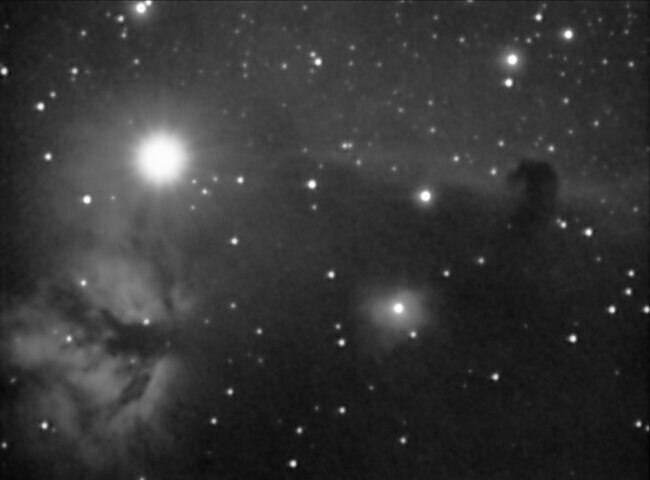 V horní části snímku je část mlhoviny IC434, na jejímž pozadí vytváří temná mlhovina B33 útvar, zvaný "Koňská hlava". Pod hvězdou Alnitak je mlhovina NGC2024 ( Flame nebula ), NGC2023 je napravo od ní.
