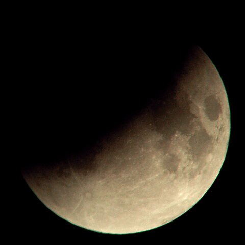 Zatmění Měsíce 9. listopadu 2003, 01:07 hod. Newton 200mm, f/4, okulár Vixen LV 15 mm Nikon Coolpix 880, zoom 8mm, ISO 100, expozice 1/100 sec.