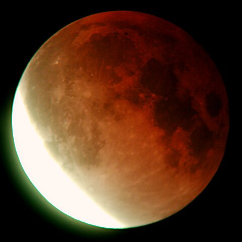 Zatmění Měsíce 9. listopadu 2003, 02:55 hod. Newton 200mm, f/4, okulár Vixen LV 15 mm Nikon Coolpix 880, zoom 8mm, ISO 100, expozice 3 sec.