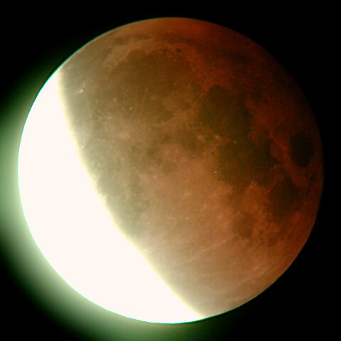 Zatmění Měsíce 9. listopadu 2003, 03:06 hod. Newton 200mm, f/4, okulár Vixen LV 15 mm Nikon Coolpix 880, zoom 8mm, ISO 100, expozice 2.5 sec.