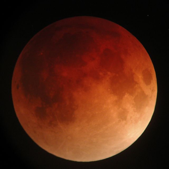Zatmění Měsíce 4. května 2004, 22:18 hod. Newton 200mm, f/4, okulár Vixen LV 15 mm Nikon Coolpix 880, zoom 8mm, ISO 100, expozice 20 sec.